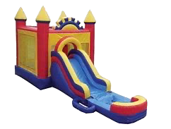 Castle Bounce House Combo A bounce house with a castle theme is sure to make your kids' dreams come true! This inflatable playhouse features a Wet/ Dry slide and a basketball hoop. It's sure to be a hit at any birthday party or family event.
