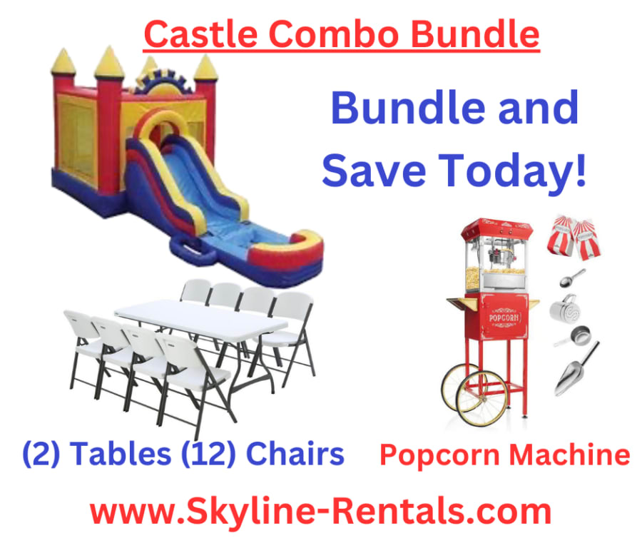 This combo party package is perfect for backyard parties and great for any party. It comes with a water slide or dry slide, 2 tables, 12 chairs, and a popcorn machine.